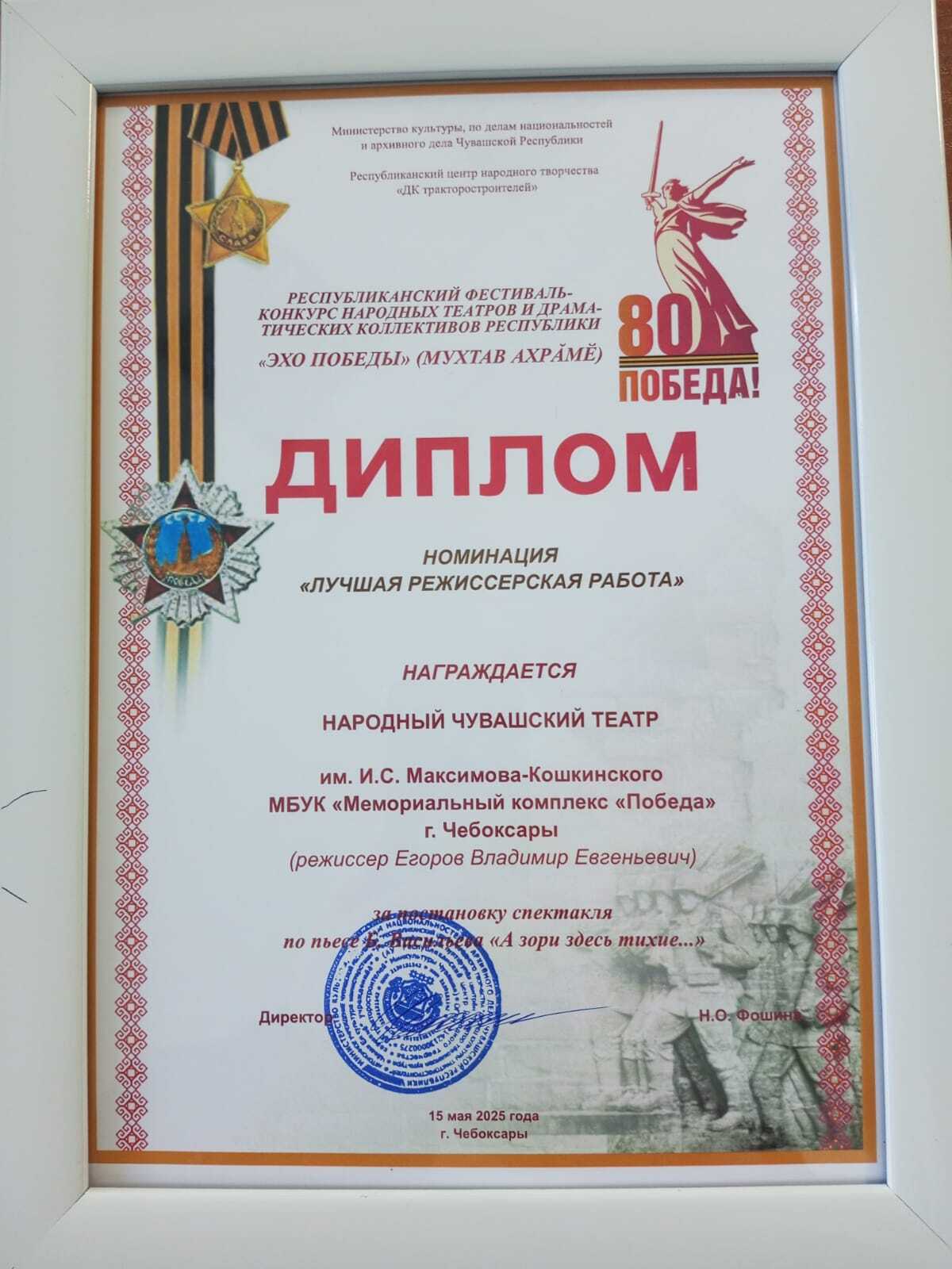 Приз и диплом за лучшую режиссёрскую работу получил режиссёр Чувашского народного театра имени И.С.Максимова-Кошкинского — Егоров Владимир Евгеньевич.