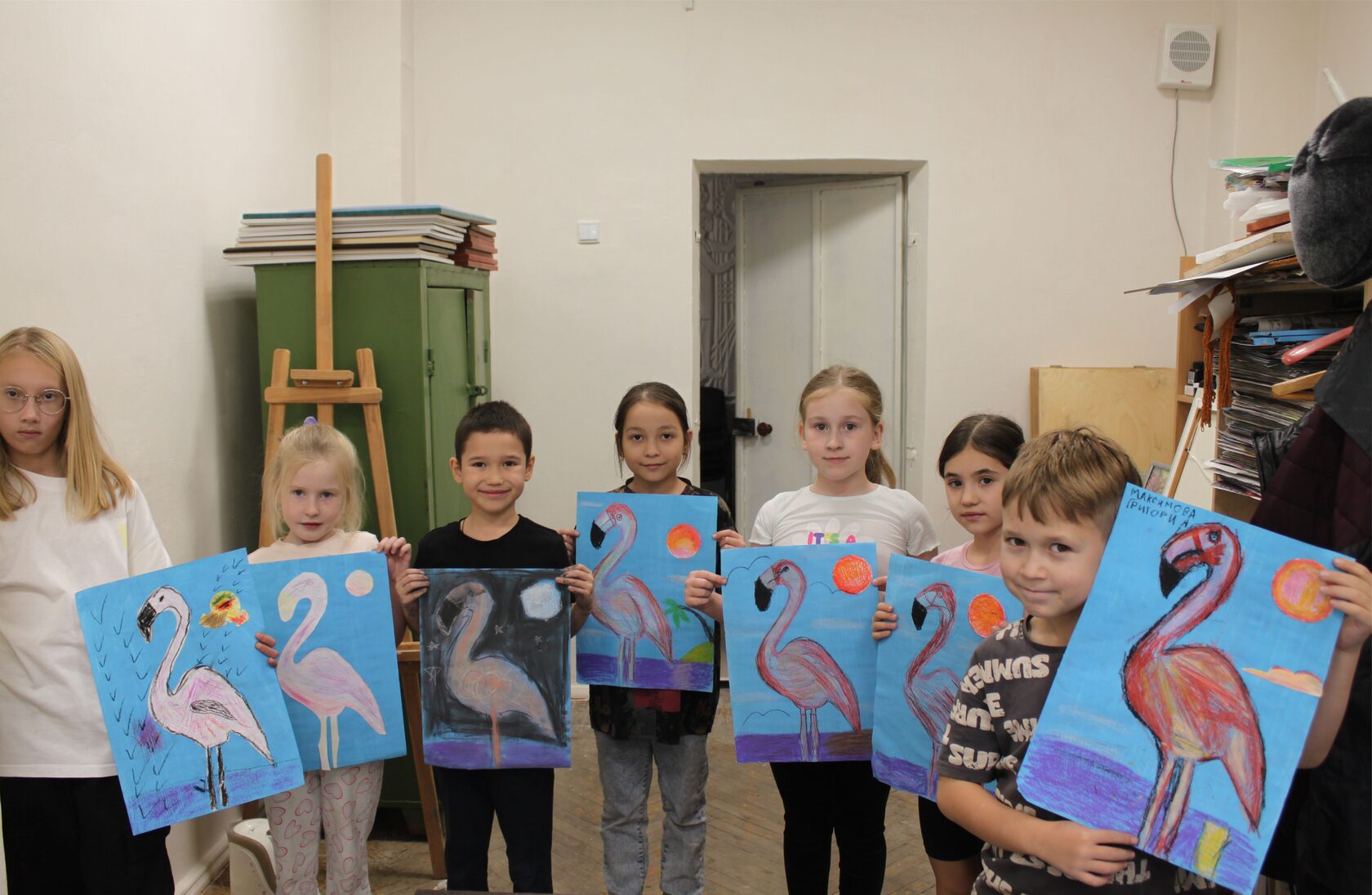 - На мастер-классе Олега Романова в студии «Весёлый карандаш» рисовали изящных фламинго и смело экспериментировали с красками.
